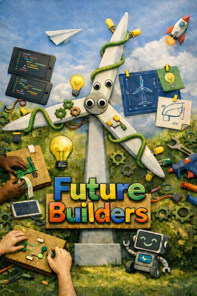 In Future Builders werk jij aan echte uitdagingen uit de wereld om je heen, zoals onveilige speelplekken, vervuiling of eenzaamheid — en zet je jouw ideeën om in actie. Je bedenkt, ontwerpt en bouwt prototypes met eenvoudige elektronica en digitale tools. Zo combineer je zelf maken met AI en technologie.